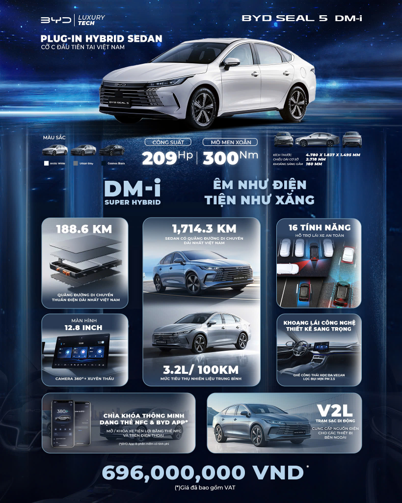 BYD Seal 5 DM-i Super Hybrid là đại diện cho thế hệ xe sedan hiện đại – kết hợp giữa hiệu suất, tiết kiệm và công nghệ thông minh.