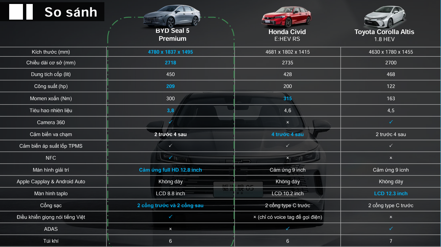 Nếu đặt lên bàn cân với các đối thủ như Toyota Corolla Altis Hybrid, Honda Civic e:HEV hay Mazda3, ưu thế của BYD Seal 5 càng trở nên rõ rệt.